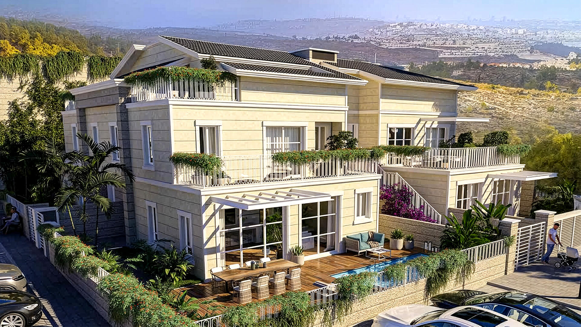 שכונת המושבה כוללת וילות פרטיות על מדרון גבעת התאנה, עם מבט פתוח אל קו ההר. כאן השקט מדויק והנוחות מורגשת בכל פרט: בכל בית מעלית פנימית, בריכה מחוממת, חימום תת-רצפתי ומפרט עשיר שמרגיש נכון מהכניסה, ועד המרפסת הפונה לנוף הפתוח.