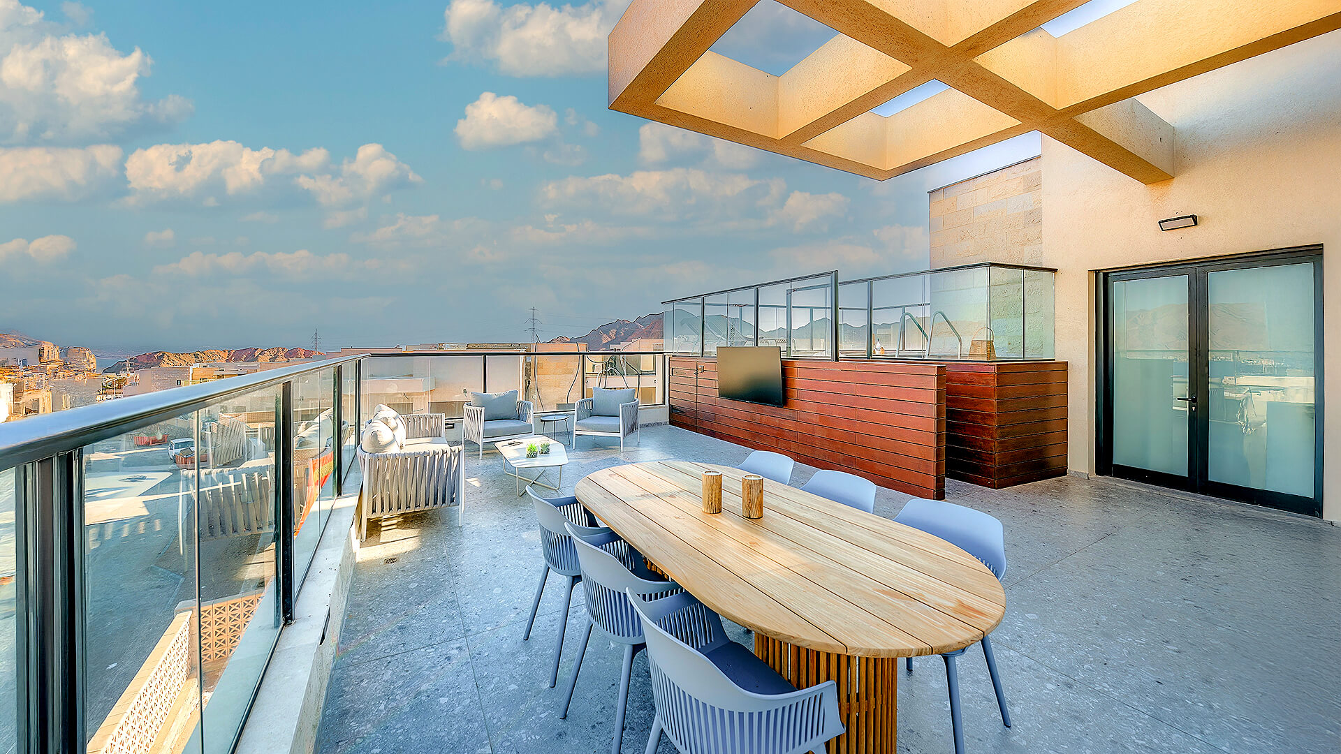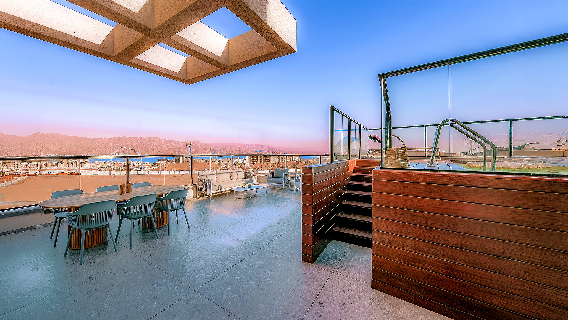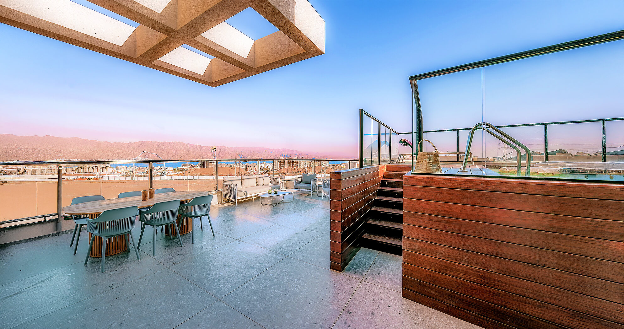 מבט פתוח שמחבר בין סלעי המדבר, העיר והים.