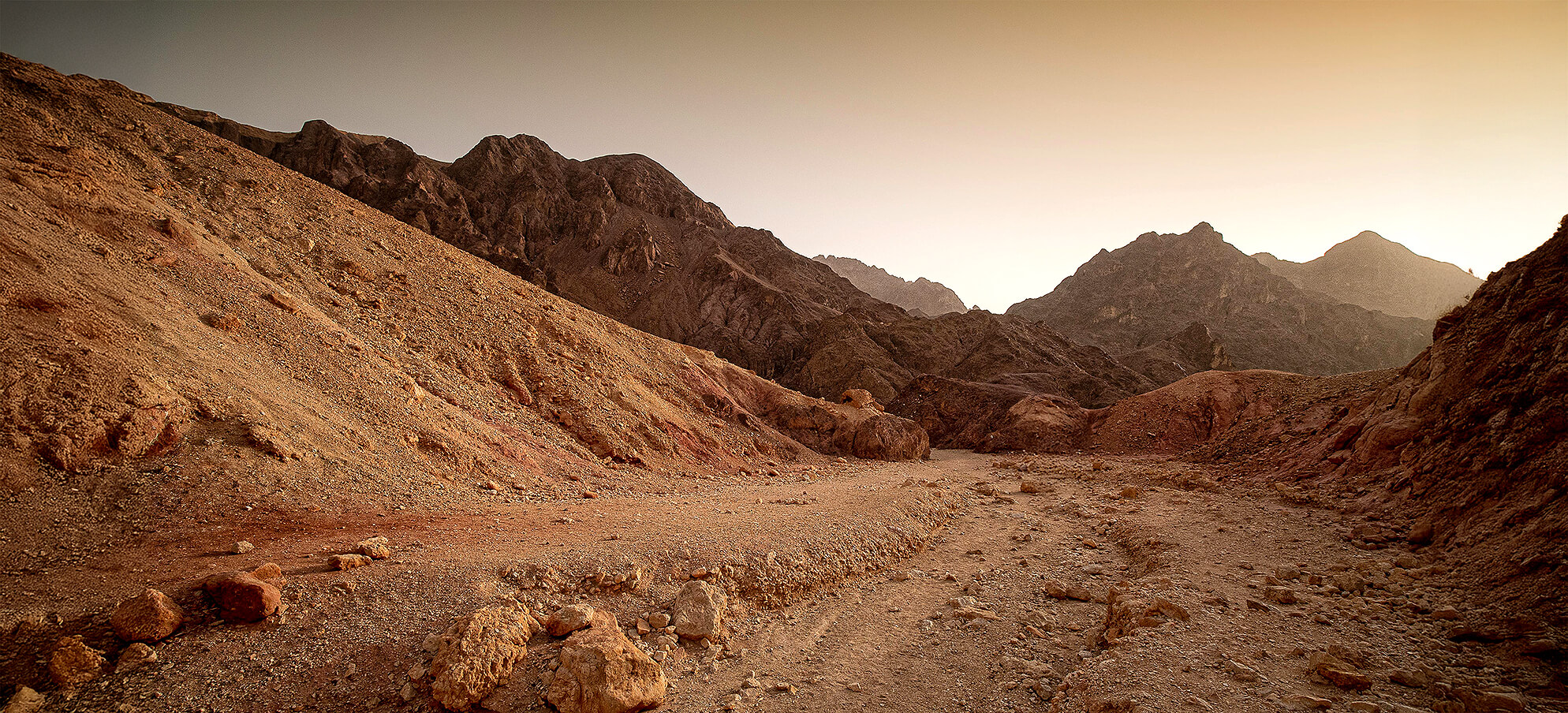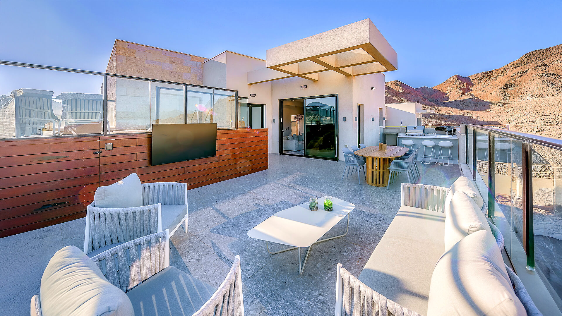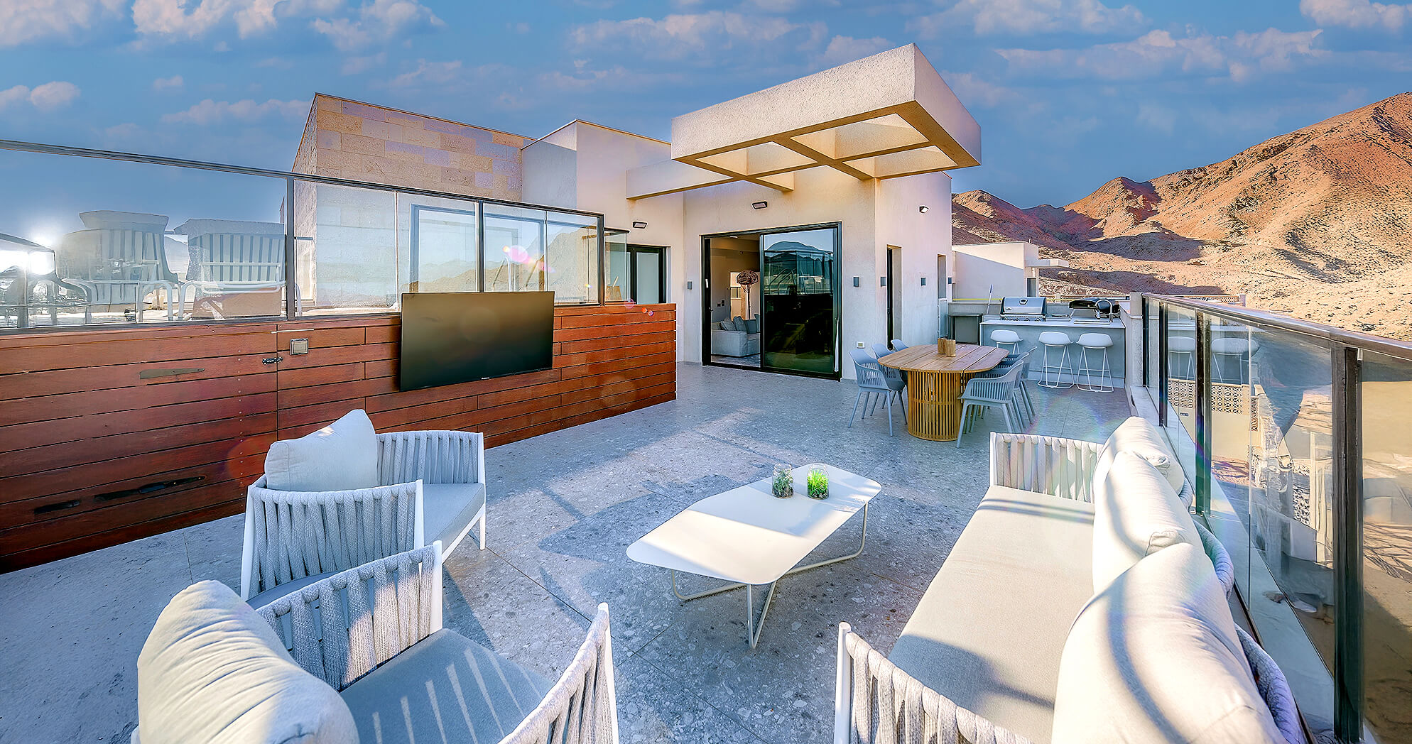 מבט פתוח שמחבר בין סלעי המדבר, העיר והים.