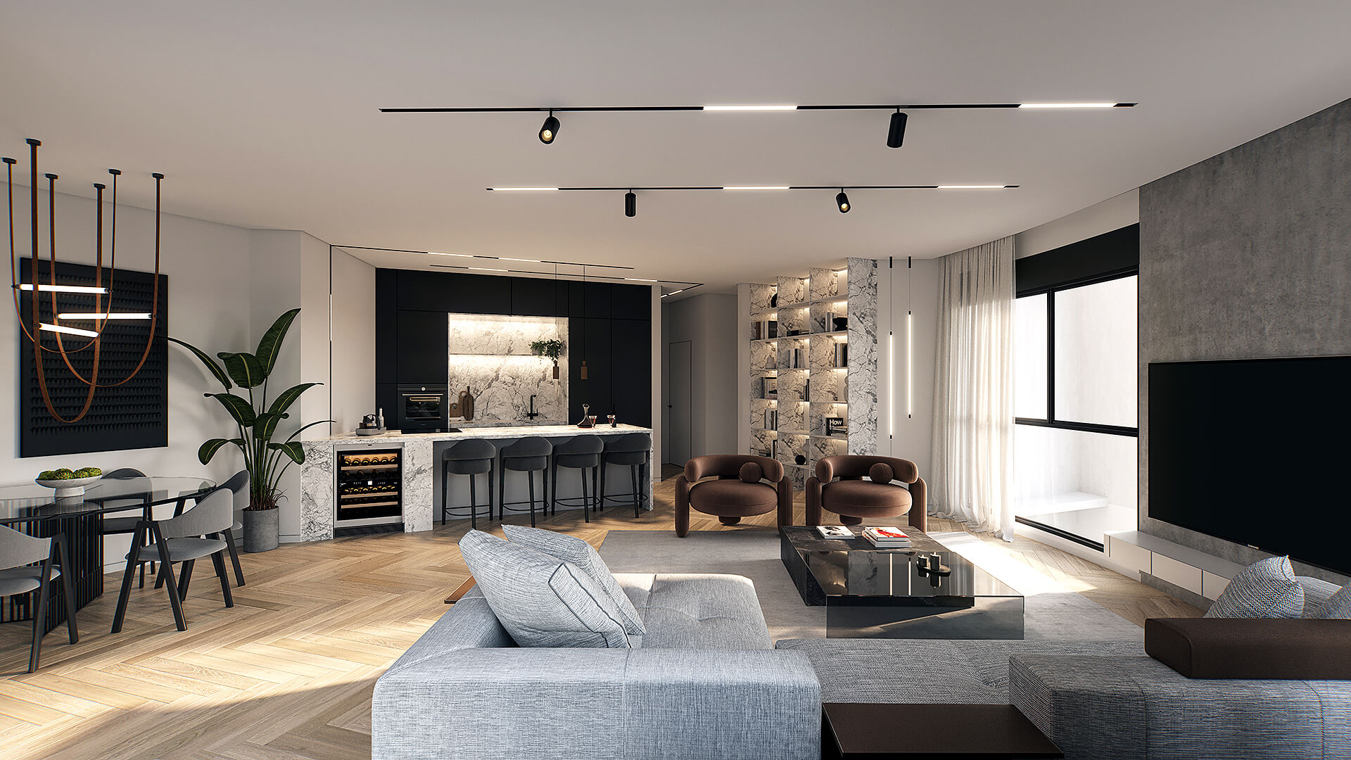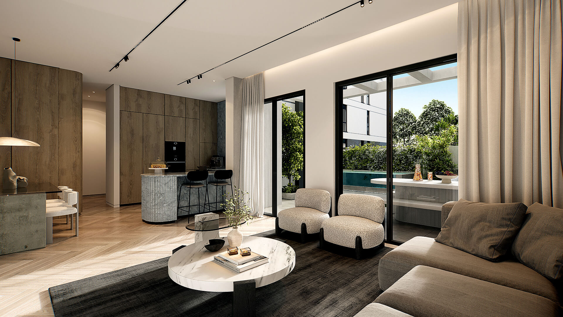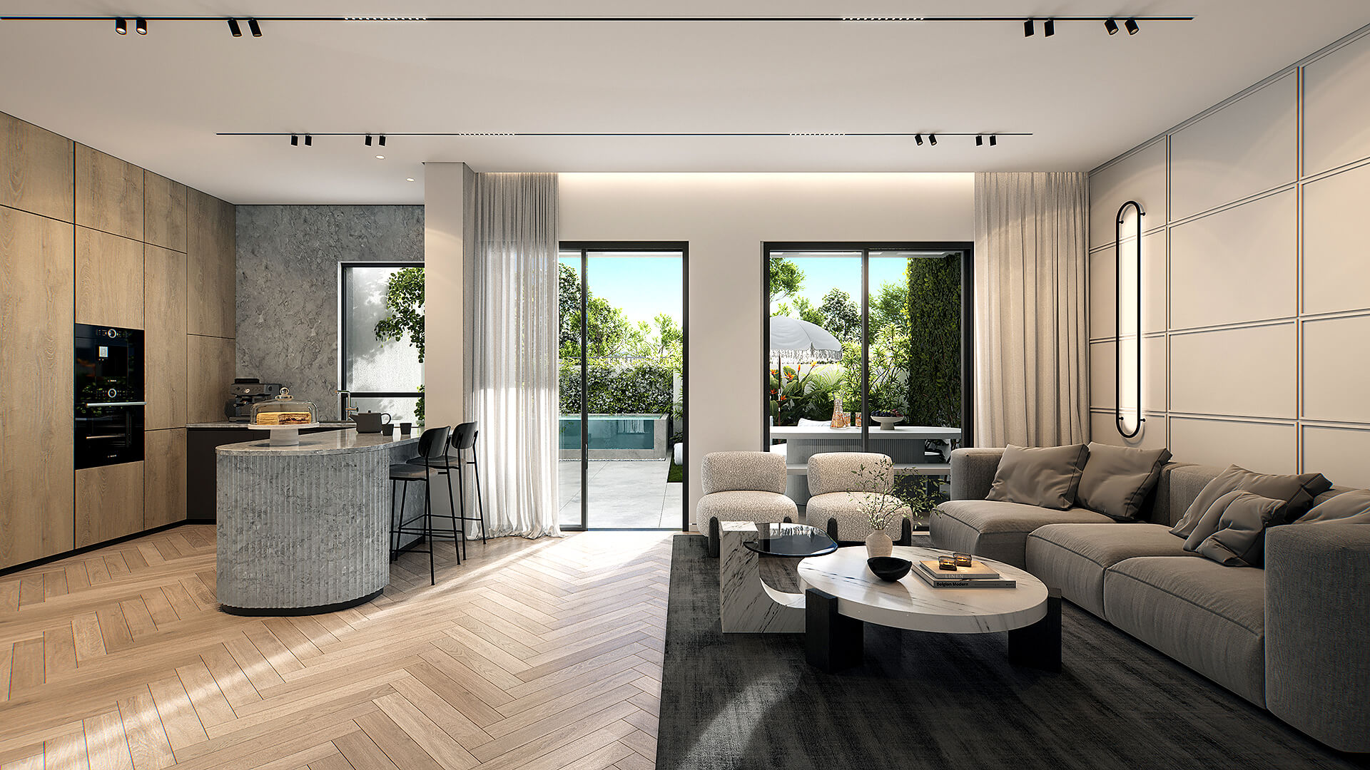 העיצוב הפנימי של הדירות נשען על אותו קו אדריכלי: חלים מאוזרים, זורמים ומזמינים, לצד פונקציונליות גבוהה, המדגישה קלילות ונוחות בכל פרט.