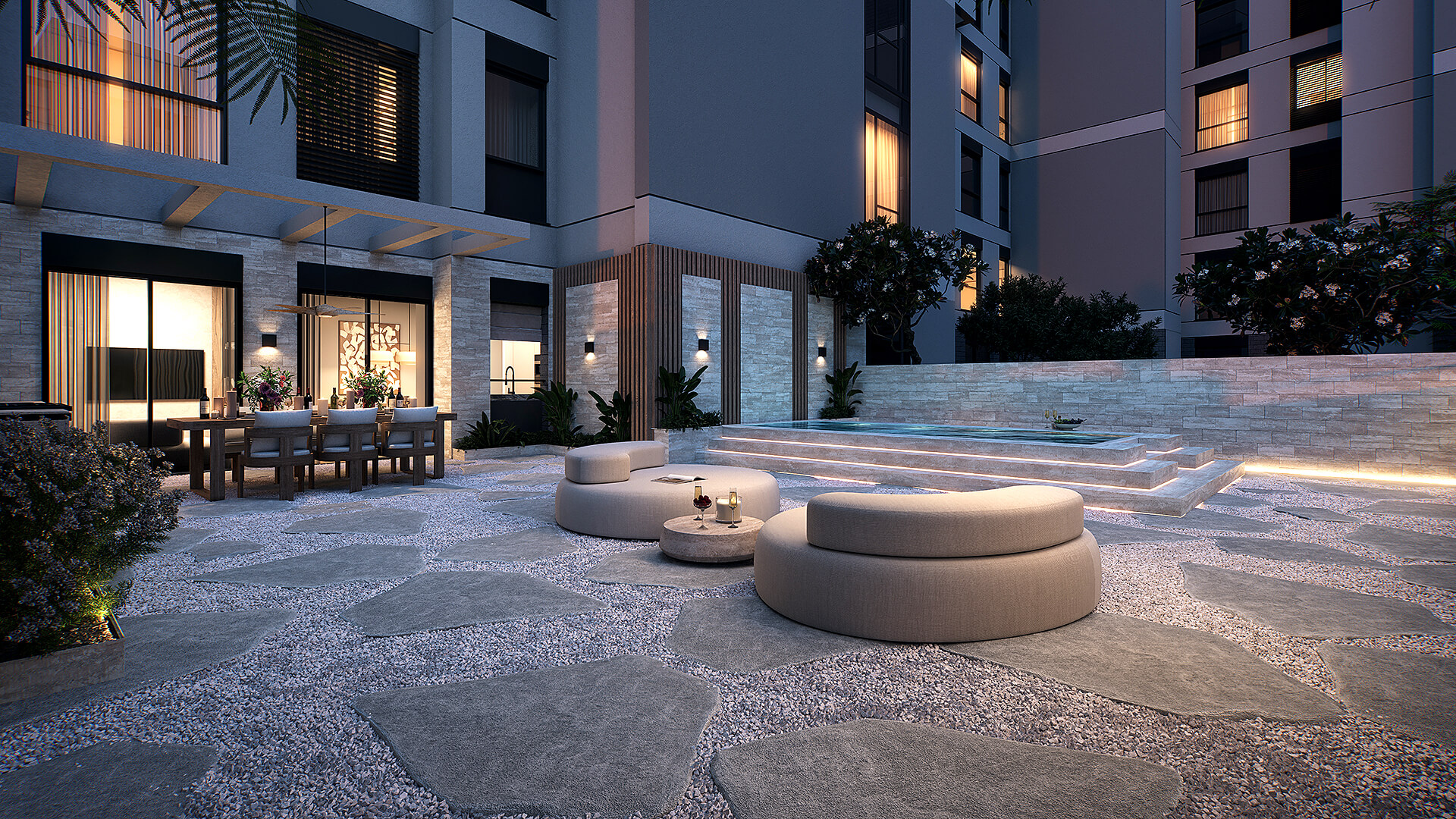התכנון האדריכלי שם את חווית המגורים במרכז, עם חצר פנימית ירוקה ומזמינה ובה צמחיה מטופחת ופינות ישיבה המזמינים את החופש פנימה לחיי היום יום.